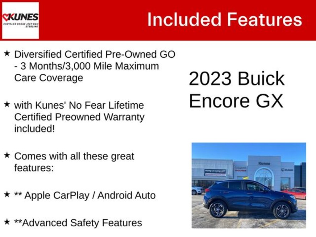 This Encore GX is a Diversified Certified Pre-Owned vehicle, which means it has undergone a rigorous inspection and reconditioning process to ensure it meets the highest standards of quality and reliability. With the added benefits of the Kunes' No Fear Lifetime Certified Preowned Warranty, you can drive with confidence, knowing your investment is protected.