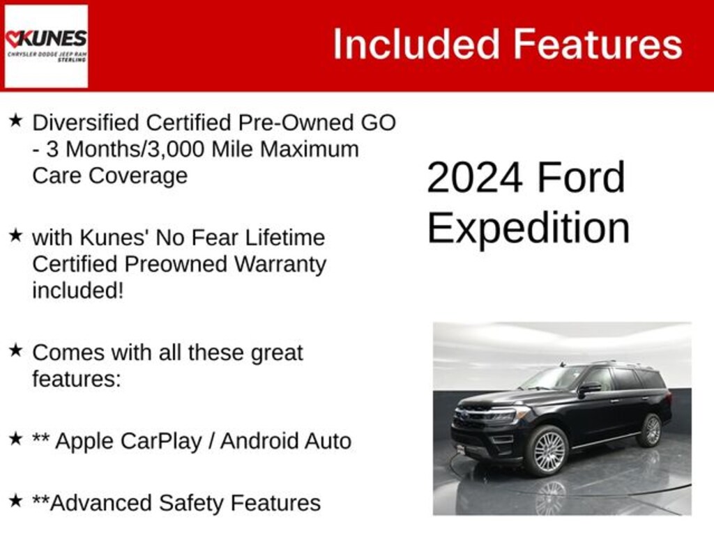 Agate Black Metallic 2024 Ford Expedition Limited Limited Diversified Certified Pre-Owned GO - 3 Months/3,000 Mile Maximum Care Coverage, with Kunes' No Fear Lifetime Certified Preowned Warranty included!, Comes with all these great features:, ** Apple CarPlay / Android Auto, **Advanced Safety Features, ** Navigation, ** Security System, **Panoramic Sunroof, ** Heated Seats, **Heated and Cooled Seats, **Heated Steering wheel, **Heated Rear Seating, 3rd Row Seating, ** Steering Wheel Controls, ** Roof Rack, ** Premium Wheels, ** Keyless Entry, ** Automatic Headlights, ** Bluetooth, ** Back up Camera, **Rear Park Assist, **SIRIUS XM, Remote Start, Ebony Black Mesh Grille, Equipment Group 301A Mid Package, Equipment Group 302A High Package, Heavy-Duty Independent Suspension, Magnetic-Painted Power Deployable Running Boards, Navigation system: Connected Navigation, Panoramic Vista Roof, Power-Folding Sideview Mirrors w/Autofold, Wheels: 22" 12-Spoke Polished Aluminum.