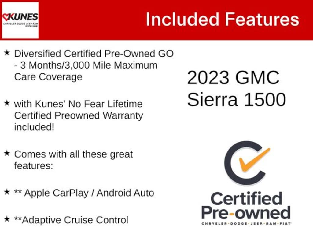 Summit White 2023 GMC Sierra 1500 Denali Denali Diversified Certified Pre-Owned GO - 3 Months/3,000 Mile Maximum Care Coverage, with Kunes' No Fear Lifetime Certified Preowned Warranty included!, Comes with all these great features:, ** Apple CarPlay / Android Auto, **Adaptive Cruise Control, ** Navigation, ** Security System, *** Moonroof/sunroof, **Heated and Cooled Seats, **Heated Steering wheel, **Heated Rear Seating, ** Steering Wheel Controls, ** Keyless Entry, ** Automatic Headlights, ** Bluetooth, ** Back up Camera, **Rear Park Assist, **SIRIUS XM, Remote Start, 10-Way Power Driver Seat Adjuster w/Lumbar, 10-Way Power Passenger Seat Adjuster w/Lumbar, 120-Volt Bed Mounted Power Outlet, 120-Volt Instrument Panel Power Outlet, 2 Charge/Data USB Ports Inside Center Console, 2 USB Ports, 3.23 Rear Axle Ratio, Adaptive suspension, Apple CarPlay/Android Auto, Auto-Locking Rear Differential, Auxiliary External Transmission Oil Cooler, Bed View Camera, Buckle to Drive, Chrome Header w/Signature Denali Chrome Grille, Chrome Recovery Hooks, Chrome Wheel To Wheel Assist Steps, Color-Keyed Carpeting Floor Covering, Compass, Deep-Tinted Glass, Delay-off headlights, Denali Premium Suspension w/Adaptive Ride Control, Electrical Steering Column Lock, Emergency communication system: OnStar and GMC connected services capable, Floor-Mounted Center Console, Forge Perforated Leather Seat Trim, Front anti-roll bar, Front Bucket Seats, Front Center Armrest, Front Rainsensing Wipers, Front reading lights, Front wheel independent suspension, Fully automatic headlights, Genuine wood console insert, Genuine wood dashboard insert, Genuine wood door panel insert, GMC Connected Access Capable, Heated 2nd Row Outboard Seats, Heated Driver & Front Outboard Passenger Seating, Heated front seats, Heated rear seats, Hill Descent Control, Hitch Guidance, Hitch Guidance w/Hitch View, Illuminated entry, In-Vehicle Trailering App, Integrated Trailer Brake Controller, Keyless Open & Start, LED Cargo Area Lighting, Navigation System, OnStar & GMC Connected Services Capable, Outside temperature display, Overhead console, Panic alarm, Passenger door bin, Perimeter Lighting, Power Front Passenger Windows w/Express Up/Down, Power Front Windows w/Driver Express Up/Down, Power passenger seat, Power Rake & Telescoping Steering Column, Power Rear Windows w/Express Down, Power Sliding Rear Window w/Rear Defogger, Premium Bose 7-Speaker Sound System, Radio data system, Radio: Premium GMC Infotainment Audio System, Rain sensing wipers, Rear Pedestrian Detection, Rear reading lights, Rear seat center armrest, Rear step bumper, Rear Wheelhouse Liners, Safety Alert Seat, SiriusXM w/360L, Speed-sensing steering, Split folding rear seat, Spray-On Pickup Bed Liner w/Denali Logo, Tachometer, Theft Deterrent System (Unauthorized Entry), Trailer Camera Provisions, Trailer Side Blind Zone Alert, Trailer Tire Pressure Monitor System, Trip computer, Ultrasonic Front & Rear Park Assist, Variably intermittent wipers, Ventilated Driver & Front Passenger Seats, Ventilated front seats, Voltmeter, Wheels: 20" x 9" Multi-Dimensional Polished Alum, Wheels: 22" High Gloss Black (LPO), Wireless Charging.