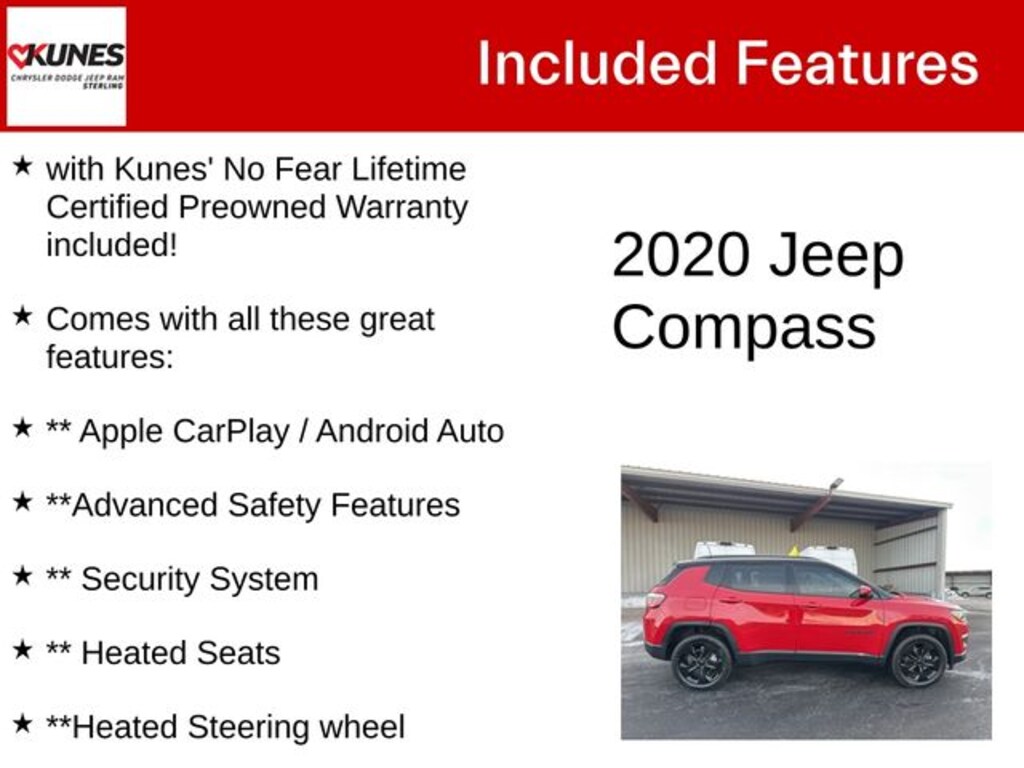 Backed by Kunes' No Fear Lifetime Certified Preowned Warranty, this Compass Altitude offers unparalleled peace of mind. You can drive with confidence, knowing that your investment is protected by an industry-leading warranty that covers your vehicle for as long as you own it.