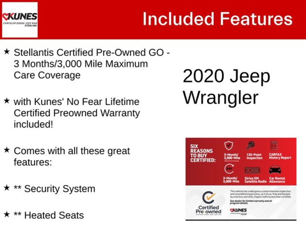 Sting-Gray Clearcoat 2020 Jeep Wrangler Unlimited Willys Unlimited Willys Stellantis Certified Pre-Owned GO - 3 Months/3,000 Mile Maximum Care Coverage, with Kunes' No Fear Lifetime Certified Preowned Warranty included!, Comes with all these great features:, ** Security System, ** Heated Seats, **Heated Steering wheel, ** Steering Wheel Controls, ** Keyless Entry, ** Automatic Headlights, ** Bluetooth, ** Back up Camera, **SIRIUS XM, Remote Start, 4-Wheel Drive Swing Gate Decal, Anti-Lock 4-Wheel Disc HD Brakes, Black 3-Piece Hard Top, Black Grille, Black Trail Rated Badge, Front fog lights, Front LED Fog Lamps, Integrated roll-over protection, LED Reflector Headlamps, Matte Black Jeep Badge, MOPAR All-Weather Floor Mats (DISC), Non-Lock Fuel Cap w/o Discriminator, Normal Duty Suspension, Occupant sensing airbag, Power Heated Mirrors, Radio: Uconnect 3 w/5" Display, Rear reading lights, Rear Window Defroster, Security Alarm, Wheels: 17" x 7.5" Black Steel Styled.