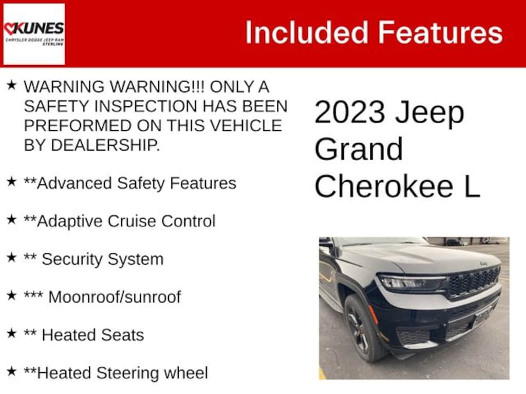 Diamond Black Crystal Pearlcoat 2023 Jeep Grand Cherokee L Altitude Altitude with Kunes' No Fear Lifetime Certified Preowned Warranty included!, Comes with all these great features:, ** Apple CarPlay / Android Auto, **Advanced Safety Features, **Adaptive Cruise Control, ** Security System, *** Moonroof/sunroof, ** Heated Seats, **Heated Steering wheel, 3rd Row Seating, ** Steering Wheel Controls, ** Roof Rack, ** Premium Wheels, ** Keyless Entry, ** Automatic Headlights, ** Bluetooth, ** Back up Camera, **Rear Park Assist, Remote Start, 115V Auxiliary Power Outlet, 180 Amp Alternator, 3rd Row Charge-Only USB Ports, 3rd row seats: split-bench, 6 Speakers, Alloy wheels, Altitude Appearance Package, Automatic Headlamp Leveling System, Black Headliner, Capri Leatherette/Suede Seats, Cloth Seats, Delay-off headlights, Delete Laredo Badge, Driver door bin, Driver vanity mirror, Front anti-roll bar, Front Bucket Seats, Front Center Armrest w/Storage, Front dual zone A/C, Front reading lights, Fully automatic headlights, Gloss Black Exterior Accents, Heated Steering Wheel, Heavy-Duty Engine Cooling, Illuminated entry, Manual Fold Seatbacks, Molded In Color Black/Gloss Black Roof Rails, MOPAR Black Side Steps, MOPAR Front Splash Guards, MOPAR Paint Protection Film, MOPAR Rear Splash Guards w/Jeep Logo, Normal Duty Suspension, Outside temperature display, Overhead console, Panic alarm, Passenger door bin, Passenger vanity mirror, Power Sunroof (DISC), Radio data system, Radio: Uconnect 5 w/8.4" Display, Rear anti-roll bar, Rear Load Leveling Suspension, Rear reading lights, Rear window wiper, Reclining 3rd row seat, Remote Start System, Selectable Tire Fill Alert, Speed-Sensitive Wipers, Split folding rear seat, Tachometer, Telescoping steering wheel, Tilt steering wheel, Trailer Hitch Zoom, Trip computer, Variably intermittent wipers, Voltmeter, Wheels: 18" x 8.0" Fully Painted Aluminum, Wheels: 18" x 8.0" Fully Painted Aluminum 1, Wireless Charging Pad. Recent Arrival!
