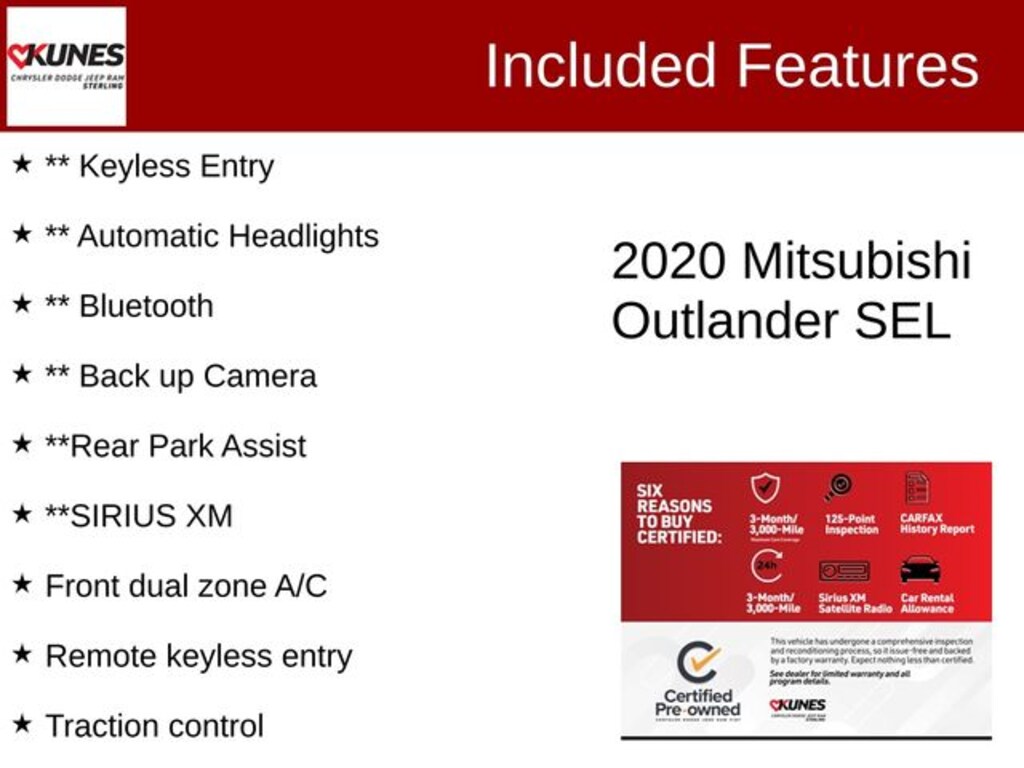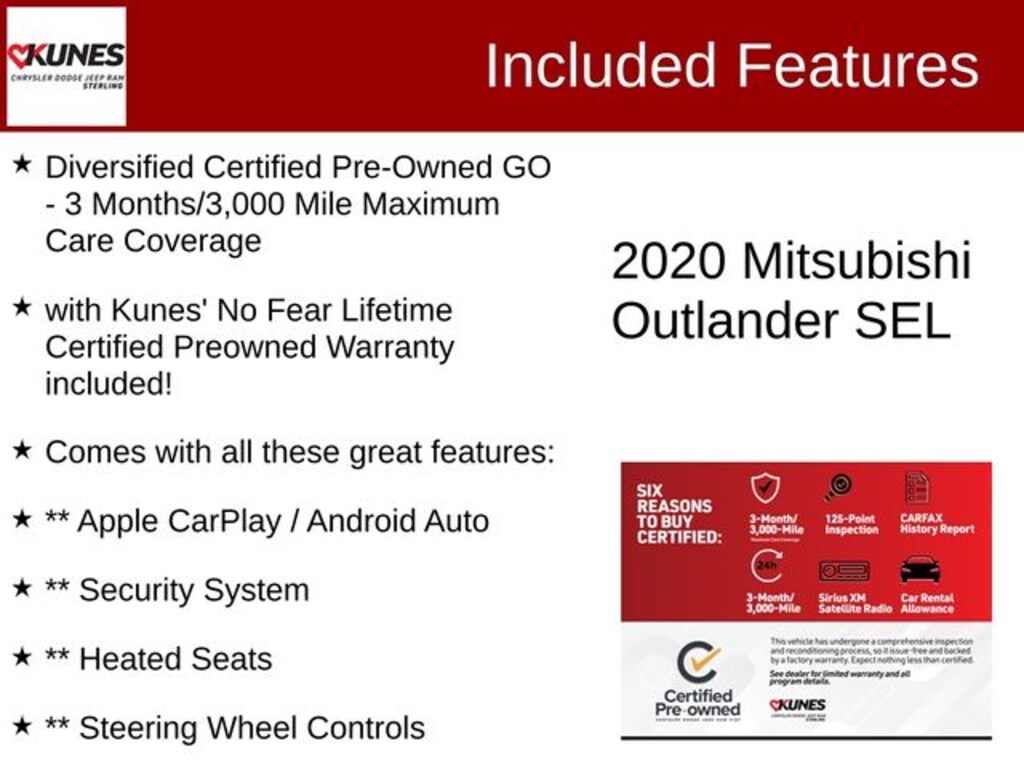 Black 2020 Mitsubishi Outlander SEL SEL Diversified Certified Pre-Owned GO - 3 Months/3,000 Mile Maximum Care Coverage, with Kunes' No Fear Lifetime Certified Preowned Warranty included!, Comes with all these great features:, ** Apple CarPlay / Android Auto, ** Security System, ** Heated Seats, ** Steering Wheel Controls, ** Keyless Entry, ** Automatic Headlights, ** Bluetooth, ** Back up Camera, **Rear Park Assist, **SIRIUS XM, 4D Sport Utility, Black, ABS brakes, Alloy wheels, Electronic Stability Control, Front dual zone A/C, Heated door mirrors, Heated Front Bucket Seats, Heated front seats, Illuminated entry, Leather Seat Trim, Low tire pressure warning, Power Liftgate, Remote keyless entry, Traction control.