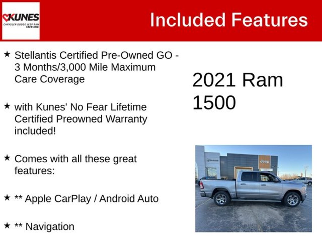Billet Silver Metallic Clearcoat 2021 Ram 1500 Big Horn/Lone Star Big Horn/Lone Star Hello, world! Stellantis Certified Pre-Owned GO - 3 Months/3,000 Mile Maximum Care Coverage, with Kunes' No Fear Lifetime Certified Preowned Warranty included!, Comes with all these great features:, ** Apple CarPlay / Android Auto, ** Navigation, ** Security System, ** Heated Seats, **Heated Steering wheel, 3rd Row Seating, ** Steering Wheel Controls, ** Keyless Entry, ** Automatic Headlights, ** Bluetooth, ** Back up Camera, **Rear Park Assist, **SIRIUS XM, Remote Start, 1-Yr SiriusXM Guardian Trial, 12" Touchscreen Display, 3 Rear Seat Head Restraints, 4 Way Front Headrests, 5-Year SiriusXM Traffic Service, 9 Amplified Speakers w/Subwoofer, Alloy wheels, Cloth Bench Seat, Disassociated Touchscreen Display, Exterior Mirrors w/Supplemental Signals, For Details, Visit DriveUconnect.com, For More Info, Call 800-643-2112, Front Center Armrest w/Storage, Front Seat Back Map Pockets, Integrated Center Stack Radio, LED Footwell Lighting, MOPAR Front & Rear Rubber Floor Mats, Outside temperature display, ParkSense Front/Rear Park Assist w/Stop, Passenger vanity mirror, Power-Folding Mirrors, Radio data system, Radio: Uconnect 3 w/5" Display, Rear seat center armrest, Rear Window Defroster, SiriusXM Satellite Radio, SiriusXM Traffic Plus, SiriusXM w/360L, Trip computer, Voltmeter, Wheels: 18" x 8" Cast-Aluminum Painted.