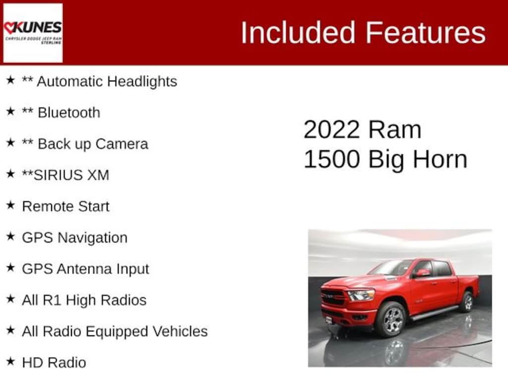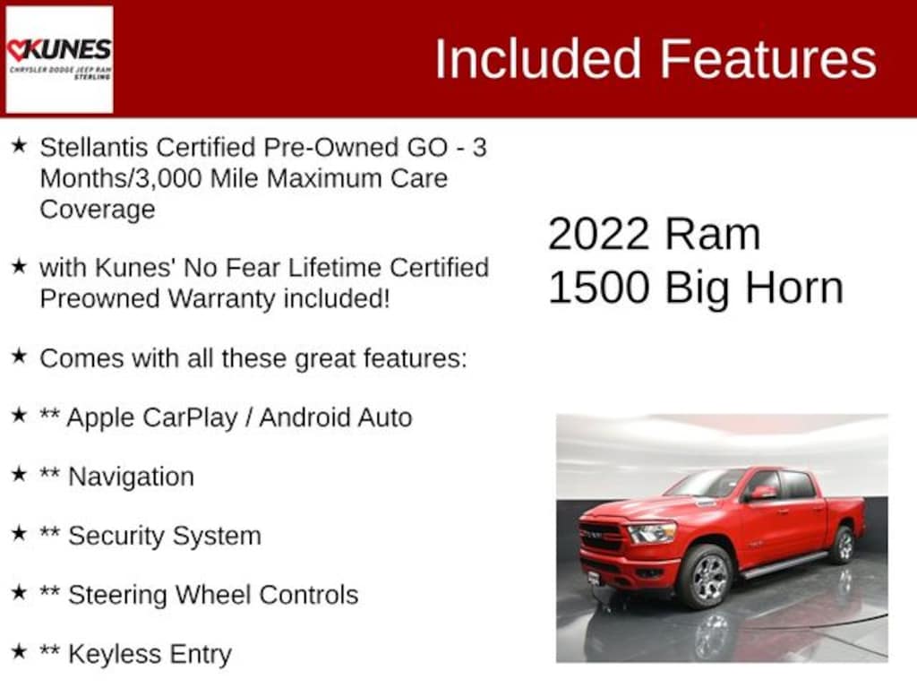 Flame Red Clearcoat 2022 Ram 1500 Big Horn/Lone Star Big Horn/Lone Star Stellantis Certified Pre-Owned GO - 3 Months/3,000 Mile Maximum Care Coverage, with Kunes' No Fear Lifetime Certified Preowned Warranty included!, Comes with all these great features:, ** Apple CarPlay / Android Auto, ** Navigation, ** Security System, ** Steering Wheel Controls, ** Keyless Entry, ** Automatic Headlights, ** Bluetooth, ** Back up Camera, **SIRIUS XM, Remote Start, 2nd Row In Floor Storage Bins, 3 Rear Seat Head Restraints, 4G LTE Wi-Fi Hot Spot, 8.4" Touchscreen Display, All Plant-Installed Decals, All R1 High Radios, All Radio Equipped Vehicles, Alloy wheels, Apple CarPlay, Auto-Dimming Exterior Driver Mirror, Auto-Dimming Rear-View Mirror, Big Horn Badge, Black Interior Accents, Black Premium Power Mirrors, Body Color Exterior Mirrors, Body Color Front Bumper, Body Color Premium Power Mirrors, Body Color Rear Bumper w/Step Pads, Bridgestone Brand Tires, Cluster 3.5" TFT Color Display, Compass, Convex Wide-Angle Mirror Insert, Delete LED Lamp - Floor Console Bin, Deluxe Cloth Bucket Seats, Driver door bin, Exterior Mirrors w/Heating Element, Exterior Mirrors w/Supplemental Signals, For Details, Visit DriveUconnect.com, Front Center Armrest w/Storage, Glove Box Lamp, Google Android Auto, GPS Antenna Input, GPS Navigation, HD Radio, Heated door mirrors, Illuminated entry, Integrated Center Stack Radio, Occupant sensing airbag, Outside temperature display, Overhead console, Panic alarm, Passenger door bin, Power 8-Way Driver Seat, Power Adjustable Pedals, Power-Folding Mirrors, Radio data system, Radio: Uconnect 3 w/5" Display, Radio: Uconnect 5 Nav w/8.4" Display, Radio: Uconnect 5 W w/8.4" Display, Rear 60/40 Folding Seat, Rear anti-roll bar, Rear Dome w/On/Off Switch Lamp, Rear Power Sliding Window, Rear seat center armrest, Rear step bumper, Rear Window Defroster, Remote keyless entry, SiriusXM Radio Service, Speed control, Split folding rear seat, Sport Decal, Sun Visors w/Illuminated Vanity Mirrors, Tachometer, Telescoping steering wheel, Tilt steering wheel, Voltmeter, Wheels: 20" x 9" Aluminum Chrome Clad (WRK).