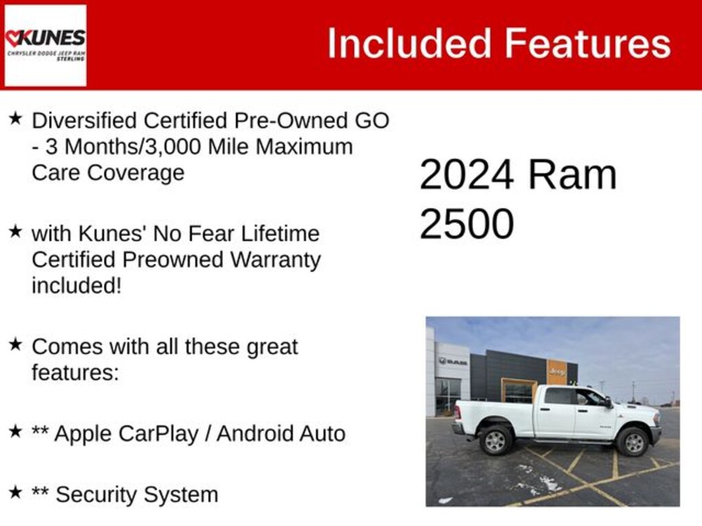 Don't miss your chance to own this exceptional 2024 Ram 2500 Big Horn. With its impressive capabilities, premium features, and Certified Pre-Owned peace of mind, it's the perfect choice for those who demand the best. Visit our showroom today and experience the power and versatility of this remarkable truck for yourself.