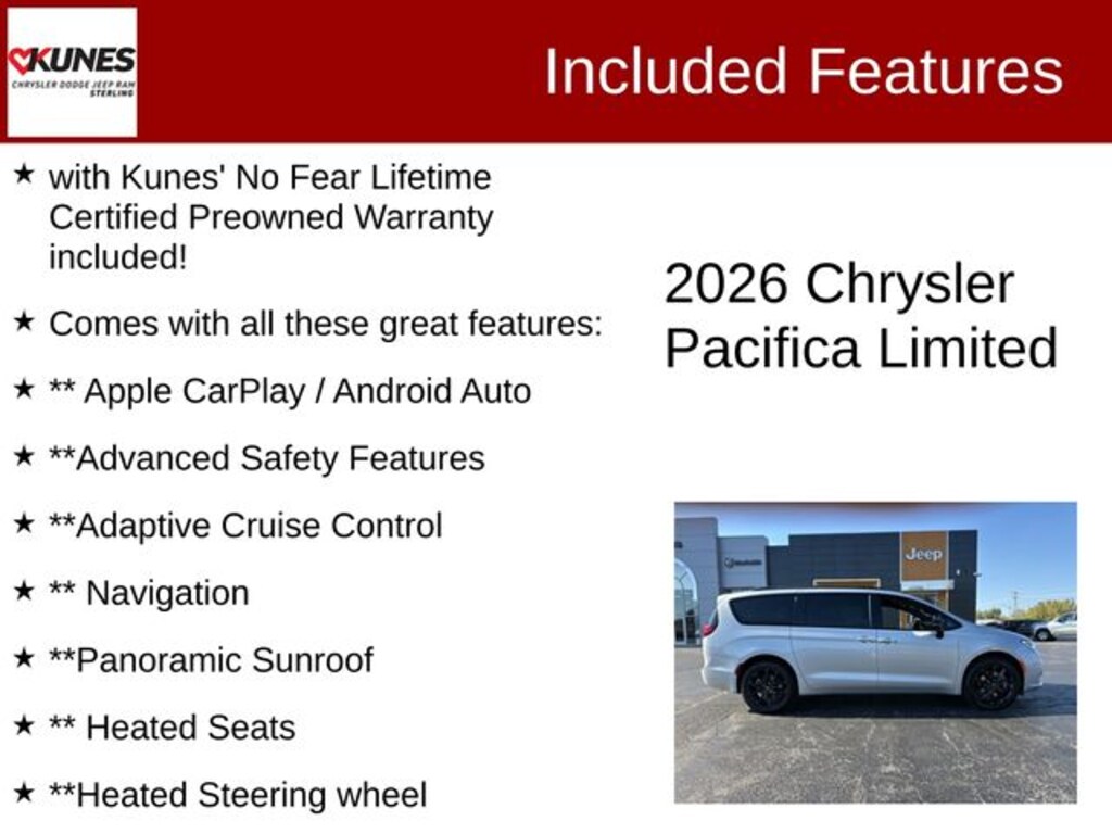 The 2026 Pacifica gives you all the passenger and storage space you need along with a fantastic 25 MPG highway! Also included with every new vehicle: LIFETIME "NO FEAR" WARRANTY, FIRST OIL CHANGE, and AT HOME COURTESY DELIVERY! Call us for full details! We pride ourselves on honesty and integrity, but please note that mistakes or misprints due to human error are possible. Find out why our dealerships have won DealerRater.com DEALER OF THE YEAR a whopping 10 TIMES! Call, email, or live chat with one of our friendly sales professionals now to schedule your test drive! Prices shown do not include taxes, license, and title fees and a $367.70 documenta Price includes: $2000 - 2026 National Overaged Select Inventory Bonus Cash . Exp. 11/03/2025 $2250 - 2026 National Retail Bonus Cash . Exp