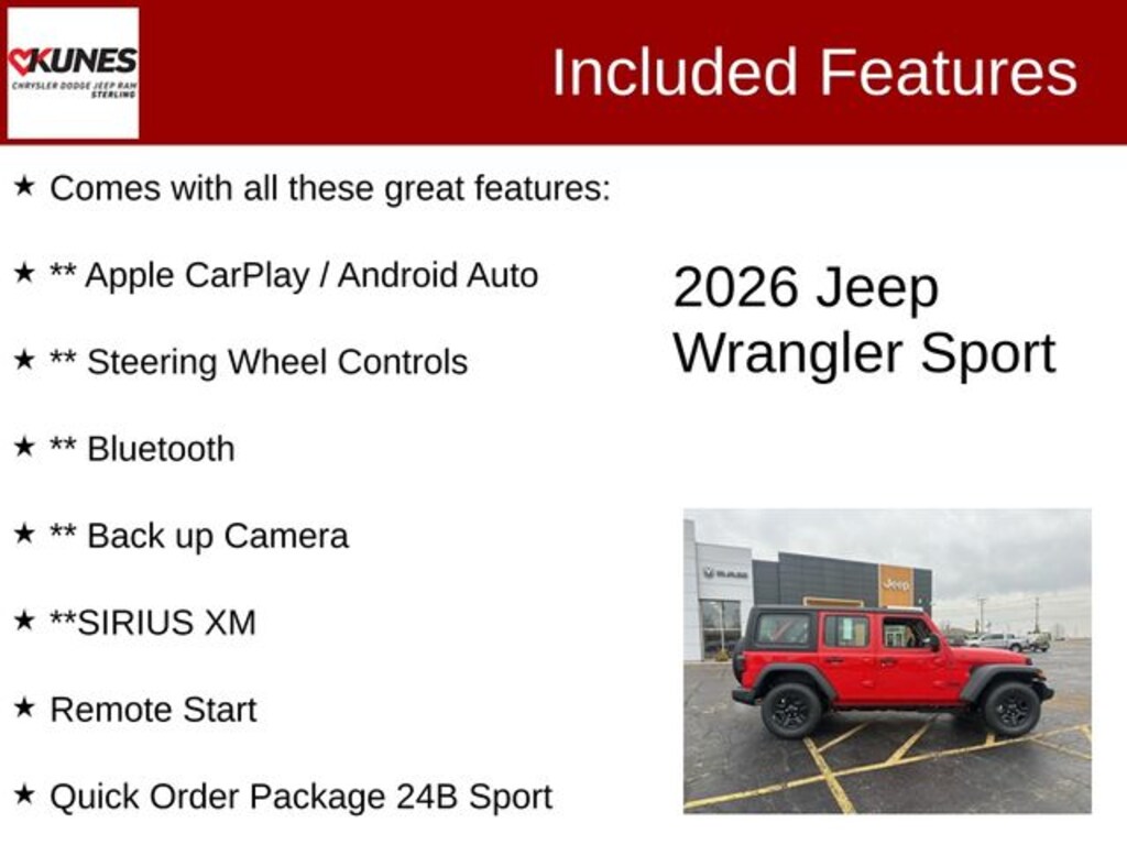The 2026 Wrangler is a fun to drive car that achieves a fantastic 23 MPG! Also included with every new vehicle: LIFETIME "NO FEAR" WARRANTY, FIRST OIL CHANGE, and AT HOME COURTESY DELIVERY! Call us for full details! We pride ourselves on honesty and integrity, but please note that mistakes or misprints due to human error are possible. Find out why our dealerships have won DealerRater.com DEALER OF THE YEAR a whopping 10 TIMES! Call, email, or live chat with one of our friendly sales professionals now to schedule your test drive! Prices shown do not include taxes, license, and title fees and a $377.63 documentary service fee.
