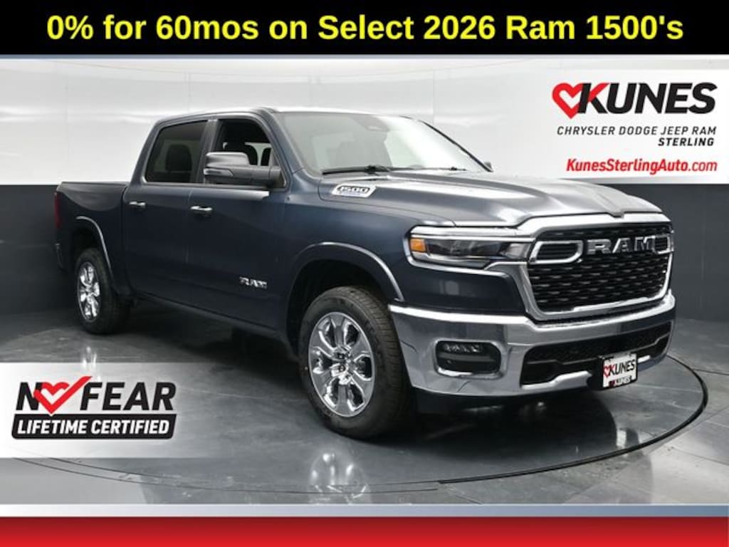 The 2026 1500 can handle any task at work or play. Also included with every new vehicle: LIFETIME "NO FEAR" WARRANTY, FIRST OIL CHANGE, and AT HOME COURTESY DELIVERY! Call us for full details! We pride ourselves on honesty and integrity, but please note that mistakes or misprints due to human error are possible. Find out why our dealerships have won DealerRater.com DEALER OF THE YEAR a whopping 10 TIMES! Call, email, or live chat with one of our friendly sales professionals now to schedule your test drive! Prices shown do not include taxes, license, and title fees and a $377.63documentary service fee. Price includes: $1000 - 2026 Midwest BC Regional Retail Bonus Cash. Exp. 04/30/2026 $3500 - 2026 National Retail Bonus Cash . Exp. 04/30/2026