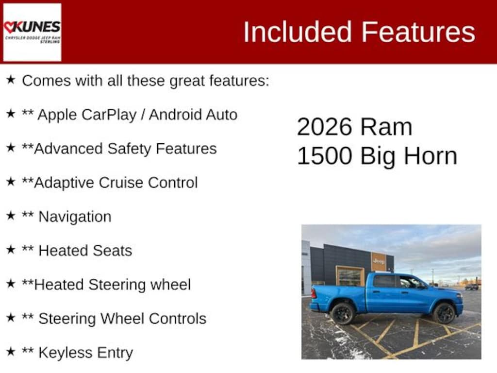 The 2026 1500 can handle any task at work or play. Also included with every new vehicle: LIFETIME "NO FEAR" WARRANTY, FIRST OIL CHANGE, and AT HOME COURTESY DELIVERY! Call us for full details! We pride ourselves on honesty and integrity, but please note that mistakes or misprints due to human error are possible. Find out why our dealerships have won DealerRater.com DEALER OF THE YEAR a whopping 10 TIMES! Call, email, or live chat with one of our friendly sales professionals now to schedule your test drive! Prices shown do not include taxes, license, and title fees and a $377.63documentary service fee. Price includes: $3500 - 2026 National Retail Consumer Cash . Exp. 03/02/2026