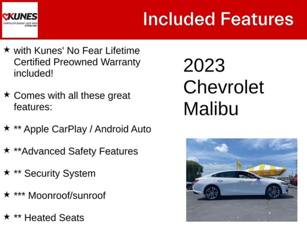Summit White 2023 Chevrolet Malibu LT 1LT LT with Kunes' No Fear Lifetime Certified Preowned Warranty included!, Comes with all these great features:, ** Apple CarPlay / Android Auto, **Advanced Safety Features, ** Security System, *** Moonroof/sunroof, ** Heated Seats, ** Steering Wheel Controls, ** Premium Wheels, ** Keyless Entry, ** Automatic Headlights, ** Bluetooth, ** Back up Camera, **Rear Park Assist, **SIRIUS XM, Remote Start, 17" Aluminum Wheels, 19" Aluminum Wheels, 6 Speakers, 6-Way Manual Front Passenger Seat Adjuster, Delay-off headlights, Emergency communication system: OnStar and Chevrolet connected services capable, Heated Driver & Front Passenger Seats, Lane Change Alert w/Side Blind Zone Alert (DISC), Power Tilt-Sliding Sunroof, Premium audio system: Chevrolet Infotainment 3 Plus, Radio data system, Rear Cross Traffic Alert (DISC), Rear Park Assist, Rear side impact airbag. Recent Arrival!