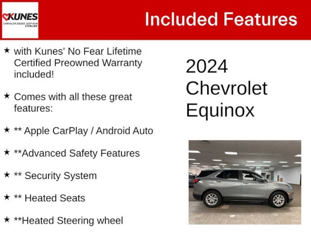 Sterling Gray Metallic 2024 Chevrolet Equinox LT LT with Kunes' No Fear Lifetime Certified Preowned Warranty included!, Comes with all these great features:, ** Apple CarPlay / Android Auto, **Advanced Safety Features, ** Security System, ** Heated Seats, **Heated Steering wheel, ** Steering Wheel Controls, ** Premium Wheels, ** Keyless Entry, ** Automatic Headlights, ** Bluetooth, ** Back up Camera, **Rear Park Assist, **SIRIUS XM, Remote Start, 17" Aluminum Wheels, 2 Rear USB Charging-Only Ports, 2 USB Ports & Auxiliary Input Jack, 2-Way Power Driver Lumbar Control Seat Adjuster, Compass, Driver 8-Way Power Seat Adjuster, Driver door bin, Front Bucket Seats, Front Center Armrest, Front Passenger 4-Way Manual Seat Adjuster, Front reading lights, Illuminated entry, Outside temperature display, Overhead console, Panic alarm, Passenger door bin, Rear reading lights, Rear seat center armrest, Speed-sensing steering, Split folding rear seat, Tachometer, Trip computer, Variably intermittent wipers. Recent Arrival!