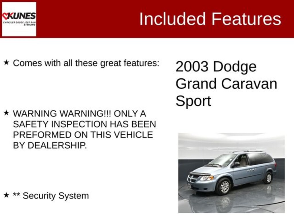 Blue 2003 Dodge Grand Caravan Sport Sport Comes with all these great features:, WARNING WARNING!!! ONLY A SAFETY INSPECTION HAS BEEN PREFORMED ON THIS VEHICLE BY DEALERSHIP., ** Security System.