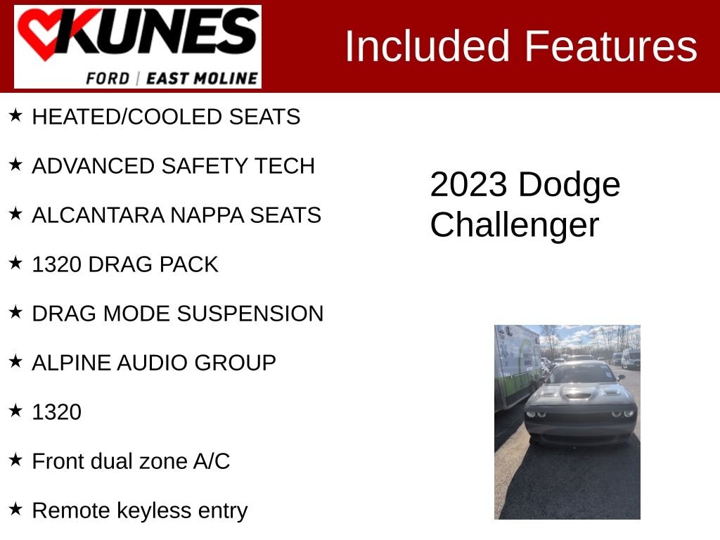 2023 Dodge Challenger R/T Scat Pack 1320 Baby Demon Destroyer Gray Clearcoat SRT HEMI 6.4L V8 MDS CARFAX One-Owner. HEATED/COOLED SEATS, ADVANCED SAFETY TECH, ALCANTARA NAPPA SEATS, 1320 DRAG PACK, DRAG MODE SUSPENSION, ALPINE AUDIO GROUP, 1 Year NMCA/NHRA Membership, 1320, 1320 Fender Badge, 1320 I/P Badge, 1320 Illuminated Air Catcher, ABS brakes, Adaptive Damping Suspension, Alloy wheels, Cargo Net, Compass, Dodge Alcantara Performance Steering Wheel, Dodge Performance Pages, Drag Mode Performance Pages, Drag Mode Suspension, Driver Floor Mat, Electronic Stability Control, Front dual zone A/C, Front Floor Mat, Front Passenger Seat Belt Delete, Heated door mirrors, Illuminated entry, Low tire pressure warning, ParkView Rear Back-Up Camera, Rear Seat Belt Delete, Remote keyless entry, Rhombi 2-Pc Wheel Center Cap, Speed Limited Engine Controller, Traction control, Transbrake, Wheels: 20" x 9.5" Low Gloss Black Drag.