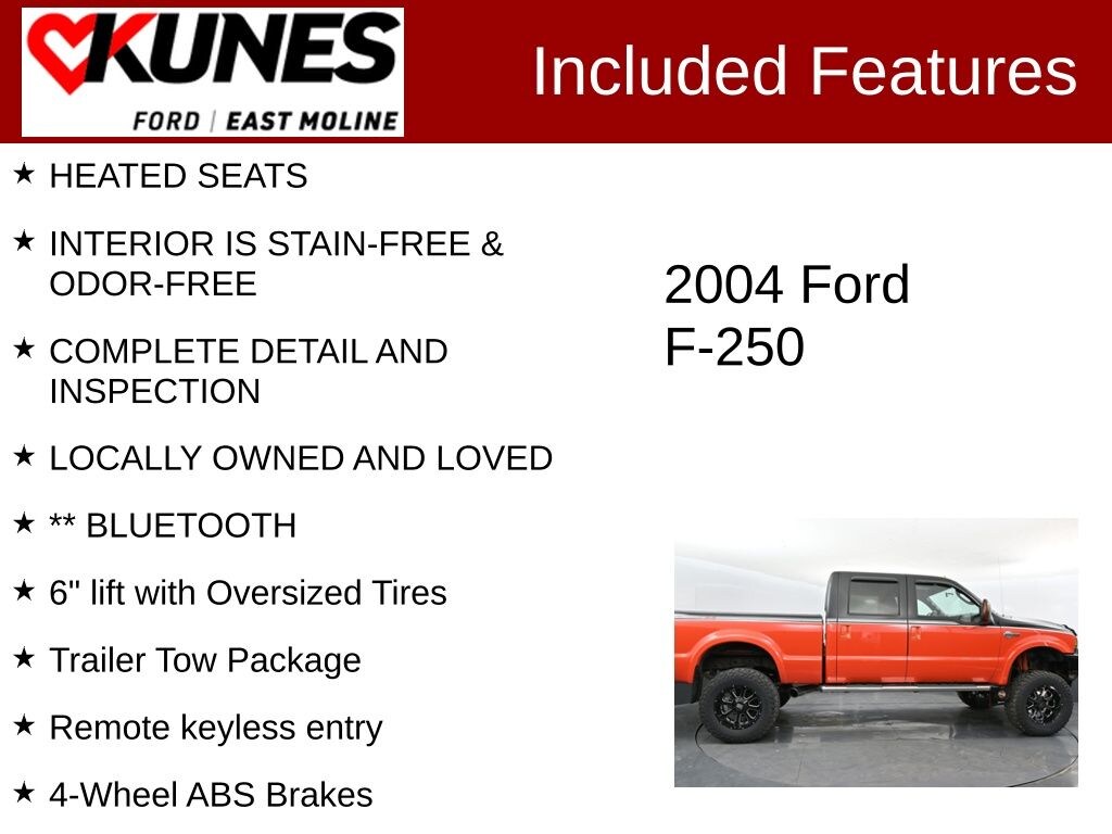 2004 Ford F-250SD Harley-Davidson Orange Power Stroke 6.0L V8 DI 32V OHV Turbodiesel HEATED SEATS, INTERIOR IS STAIN-FREE & ODOR-FREE, COMPLETE DETAIL AND INSPECTION, LOCALLY OWNED AND LOVED, ** BLUETOOTH, 6" lift with Oversized Tires, Power Stroke 6.0L V8 DI 32V OHV Turbodiesel, 4WD, 4-Wheel ABS Brakes, ABS brakes, Alloy wheels, Compass, Fog Lamps, Illuminated entry, Remote keyless entry, Trailer Tow Package.