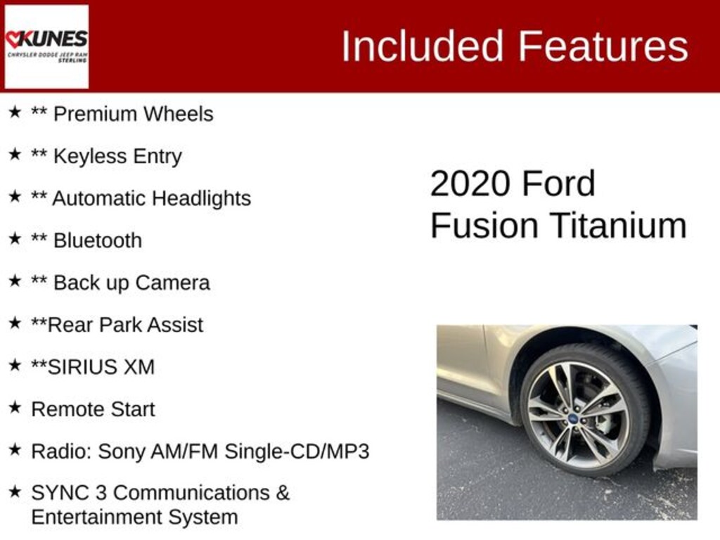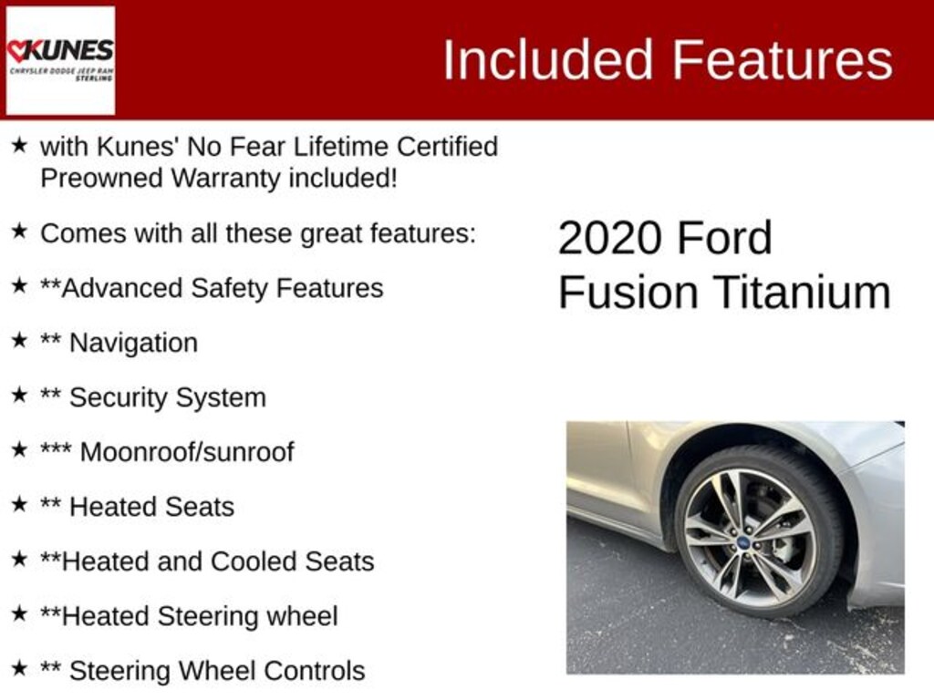 Silver Metallic 2020 Ford Fusion Titanium Titanium with Kunes' No Fear Lifetime Certified Preowned Warranty included!, Comes with all these great features:, **Advanced Safety Features, ** Navigation, ** Security System, *** Moonroof/sunroof, ** Heated Seats, **Heated and Cooled Seats, **Heated Steering wheel, ** Steering Wheel Controls, ** Premium Wheels, ** Keyless Entry, ** Automatic Headlights, ** Bluetooth, ** Back up Camera, **Rear Park Assist, **SIRIUS XM, Remote Start, AM/FM radio: SiriusXM, CD PLAYER, Radio data system, Radio: Sony AM/FM Single-CD/MP3, SYNC 3 Communications & Entertainment System, Voice-Activated Touchscreen Navigation System.