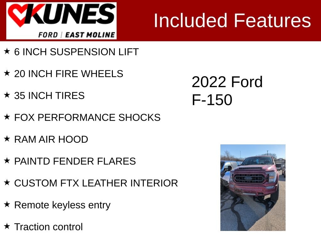 2022 Ford F-150 LIFTED FTX Rapid Red Metallic Tinted Clearcoat 5.0L V8 CARFAX One-Owner. 6 INCH SUSPENSION LIFT, 20 INCH FIRE WHEELS, 35 INCH TIRES, FOX PERFORMANCE SHOCKS, RAM AIR HOOD, PAINTD FENDER FLARES, CUSTOM FTX LEATHER INTERIOR, 4WD, ABS brakes, Compass, Electronic Stability Control, Illuminated entry, Low tire pressure warning, Remote keyless entry, Traction control.