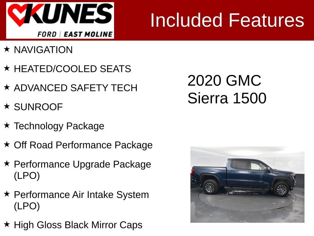 2020 GMC Sierra 1500 AT4 Pacific Blue Metallic EcoTec3 6.2L V8 Clean CARFAX. NAVIGATION, HEATED/COOLED SEATS, ADVANCED SAFETY TECH, SUNROOF, 10-Speed Automatic, 4WD, Jet Black w/Perforated Leather-Appointed Front Seat Trim, 8" Driver Information Center, Bed View Camera, Cat-Back Performance Exhaust (LPO), HD Surround Vision w/2 Trailer View Camera Provisions, High Gloss Black Mirror Caps, Multicolor 15" Diagonal Head-Up Display, Off Road Performance Package, Performance Air Intake System (LPO), Performance Upgrade Package (LPO), Rear Camera Mirror, Technology Package. Odometer is 14749 miles below market average!