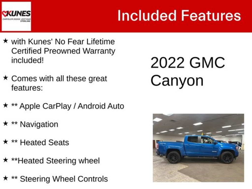 Dynamic Blue Metallic 2022 GMC Canyon Elevation Elevation with Kunes' No Fear Lifetime Certified Preowned Warranty included!, Comes with all these great features:, ** Apple CarPlay / Android Auto, ** Navigation, ** Heated Seats, **Heated Steering wheel, ** Steering Wheel Controls, ** Automatic Headlights, ** Bluetooth, ** Back up Camera, **Rear Park Assist, **SIRIUS XM, Remote Start, Canyon Elevation, 4D Crew Cab, 4WD, Jet Black w/Cloth Seat Trim. Recent Arrival!