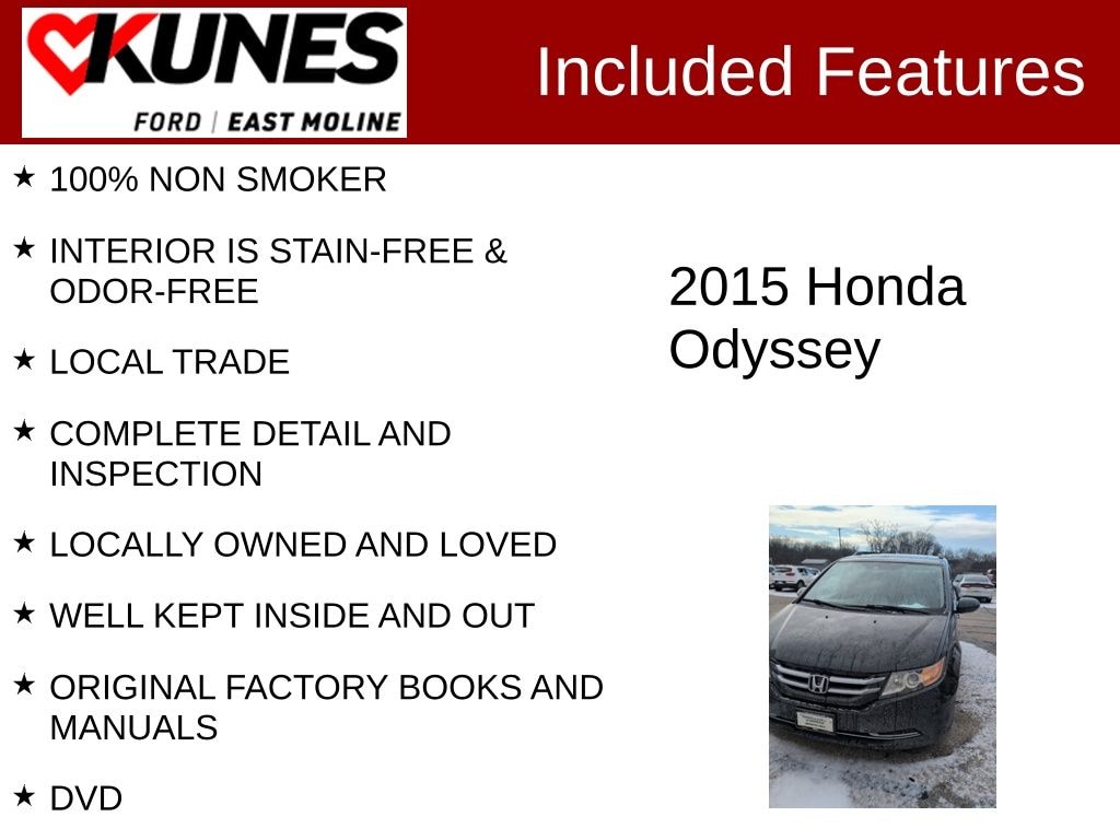 2015 Honda Odyssey EX-L Black 3.5L V6 SOHC i-VTEC 24V 100% NON SMOKER, INTERIOR IS STAIN-FREE & ODOR-FREE, LOCAL TRADE, COMPLETE DETAIL AND INSPECTION, LOCALLY OWNED AND LOVED, WELL KEPT INSIDE AND OUT, ORIGINAL FACTORY BOOKS AND MANUALS, DVD. 19/28 City/Highway MPG