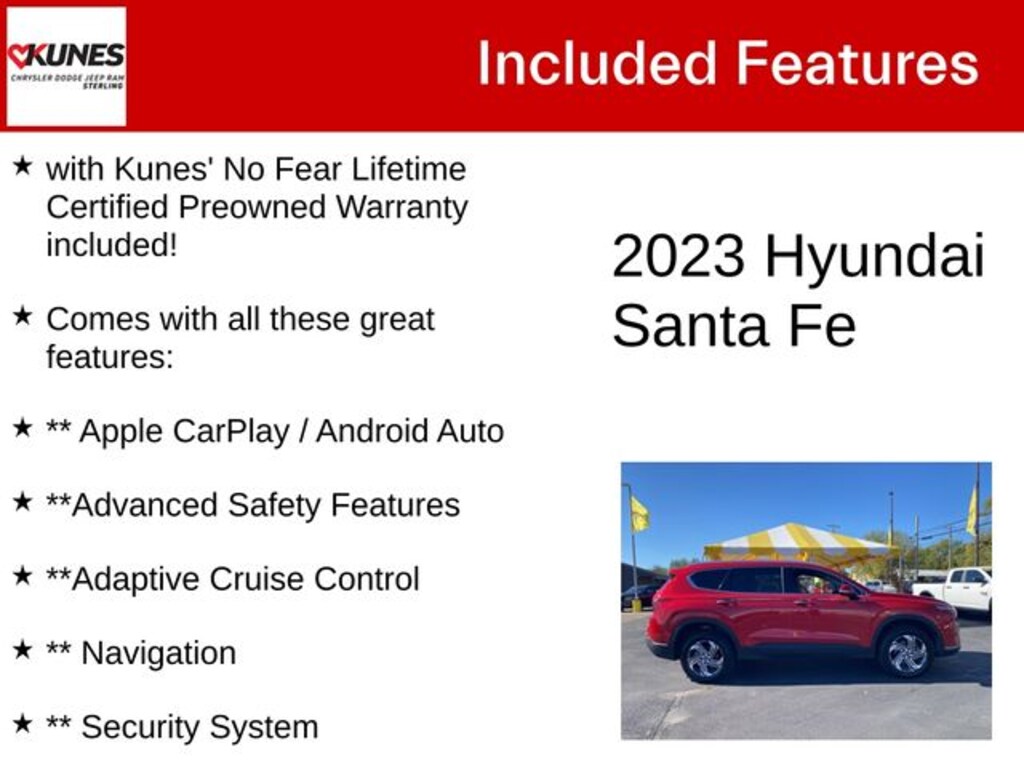 Calypso Red 2023 Hyundai Santa Fe SEL SEL with Kunes' No Fear Lifetime Certified Preowned Warranty included!, Comes with all these great features:, ** Apple CarPlay / Android Auto, **Advanced Safety Features, **Adaptive Cruise Control, ** Navigation, ** Security System, ** Heated Seats, ** Steering Wheel Controls, ** Premium Wheels, ** Keyless Entry, ** Automatic Headlights, ** Bluetooth, ** Back up Camera, **SIRIUS XM, Remote Start. Recent Arrival!