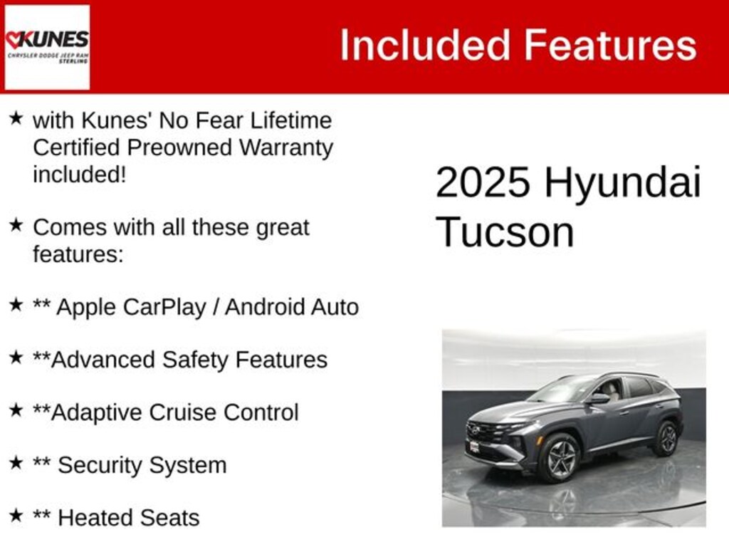 Ecotronic Gray 2025 Hyundai Tucson SEL SEL with Kunes' No Fear Lifetime Certified Preowned Warranty included!, Comes with all these great features:, ** Apple CarPlay / Android Auto, **Advanced Safety Features, **Adaptive Cruise Control, ** Security System, ** Heated Seats, 3rd Row Seating, ** Steering Wheel Controls, ** Keyless Entry, ** Automatic Headlights, ** Bluetooth, ** Back up Camera, **SIRIUS XM, Option Group 01. Recent Arrival!