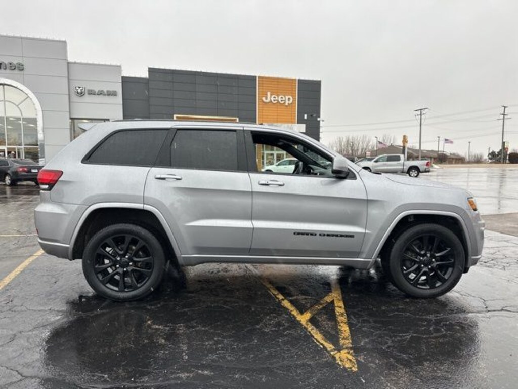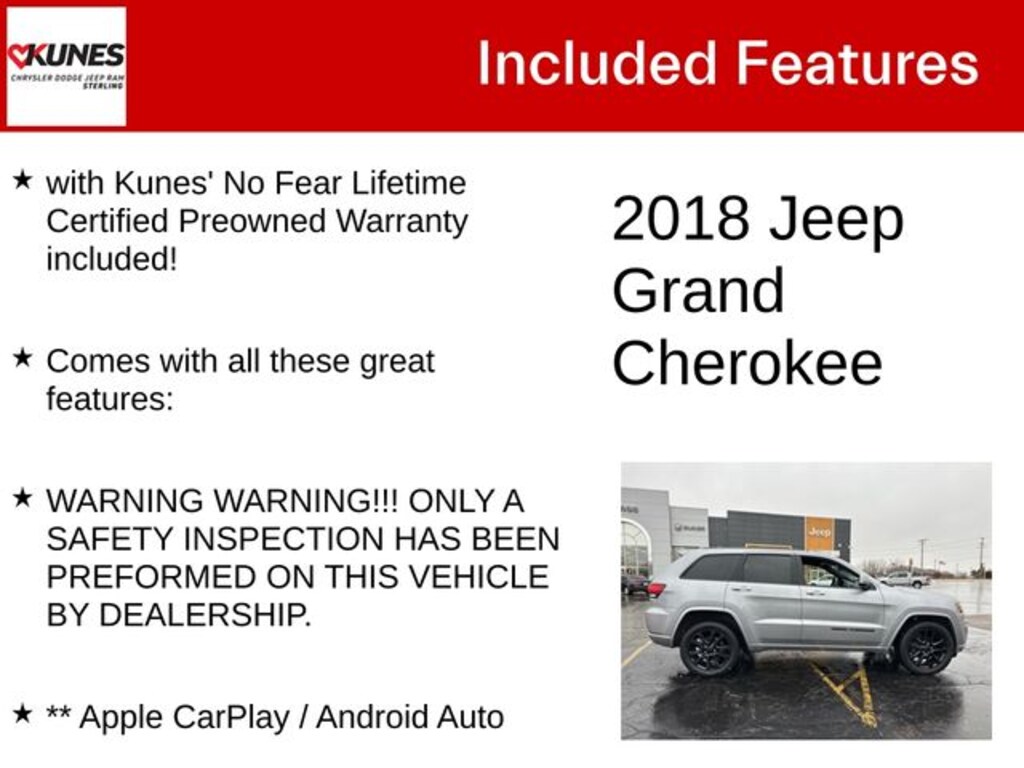 Billet Silver Metallic Clearcoat 2018 Jeep Grand Cherokee Altitude Altitude with Kunes' No Fear Lifetime Certified Preowned Warranty included!, Comes with all these great features:, WARNING WARNING!!! ONLY A SAFETY INSPECTION HAS BEEN PREFORMED ON THIS VEHICLE BY DEALERSHIP., ** Apple CarPlay / Android Auto, ** Navigation, ** Security System, ** Heated Seats, **Heated Steering wheel, ** Steering Wheel Controls, ** Keyless Entry, ** Automatic Headlights, ** Bluetooth, ** Back up Camera, **Rear Park Assist, **SIRIUS XM, Remote Start, 1-Year SiriusXM Radio Service, 115V Auxiliary Power Outlet, Alloy wheels, Apple CarPlay, Black Suede Seats w/Black Stitching, Cargo Compartment Cover, Cloth Bucket Seats, Dark Headlamp Bezel Finish, Dark Lens Taillamps, Front Bucket Seats, Front Center Armrest w/Storage, Front reading lights, Gloss Black Rear Fascia Applique, Google Android Auto, GPS Antenna Input, GPS Navigation, HD Radio, Illuminated entry, Integrated Voice Command w/Bluetooth, Jeep Black Gloss Badging, Leather Shift Knob, Outside temperature display, Overhead console, Panic alarm, Passenger door bin, Power 4-Way Driver Lumbar Adjust, Power 8-Way Driver/Manual Passenger Seat, Power Liftgate, Radio: Uconnect 4 w/7" Display, Radio: Uconnect 4C Nav w/8.4" Display, Rear Fascia Black MIC Step Pad, Rear reading lights, Rear seat center armrest, Rear window wiper, Speed-Sensitive Wipers, Split folding rear seat, Tachometer, Telescoping steering wheel, Tilt steering wheel, Variably intermittent wipers, Wheels: 17" x 8.0" Silver Aluminum. Recent Arrival!