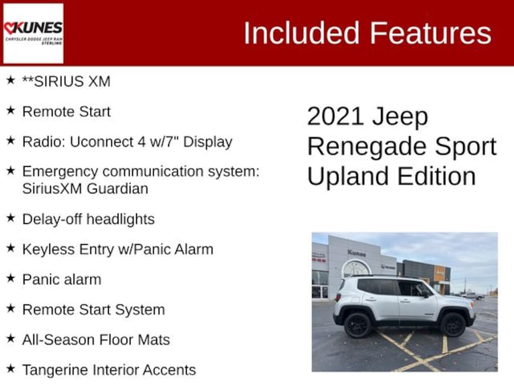 Glacier Metallic Clearcoat 2021 Jeep Renegade Sport Sport with Kunes' No Fear Lifetime Certified Preowned Warranty included!, Comes with all these great features:, ** Apple CarPlay / Android Auto, **Advanced Safety Features, ** Security System, ** Steering Wheel Controls, ** Keyless Entry, ** Automatic Headlights, ** Bluetooth, ** Back up Camera, **SIRIUS XM, Remote Start, 16" x 6.5" Styled Steel Wheels, All-Season Floor Mats, Black Side Roof Rails, Deep Tint Sunscreen Glass, Delay-off headlights, Emergency communication system: SiriusXM Guardian, Front Center Armrest, Front reading lights, Illuminated entry, Keyless Entry w/Panic Alarm, Panic alarm, Radio: Uconnect 4 w/7" Display, Remote Start System, Split folding rear seat, Tangerine Interior Accents.