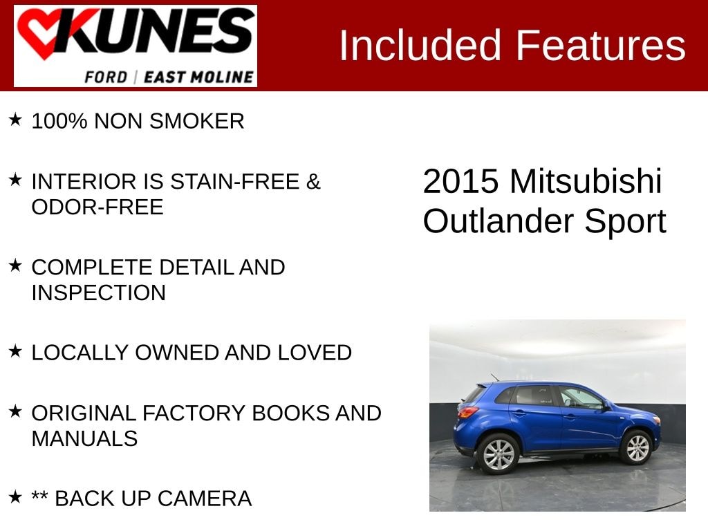 2015 Mitsubishi Outlander Sport ES Octane Blue Metallic 2.0L I4 MIVEC DOHC I4 100% NON SMOKER, INTERIOR IS STAIN-FREE & ODOR-FREE, COMPLETE DETAIL AND INSPECTION, LOCALLY OWNED AND LOVED, ORIGINAL FACTORY BOOKS AND MANUALS, ** BACK UP CAMERA, 4WD. 24/30 City/Highway MPG