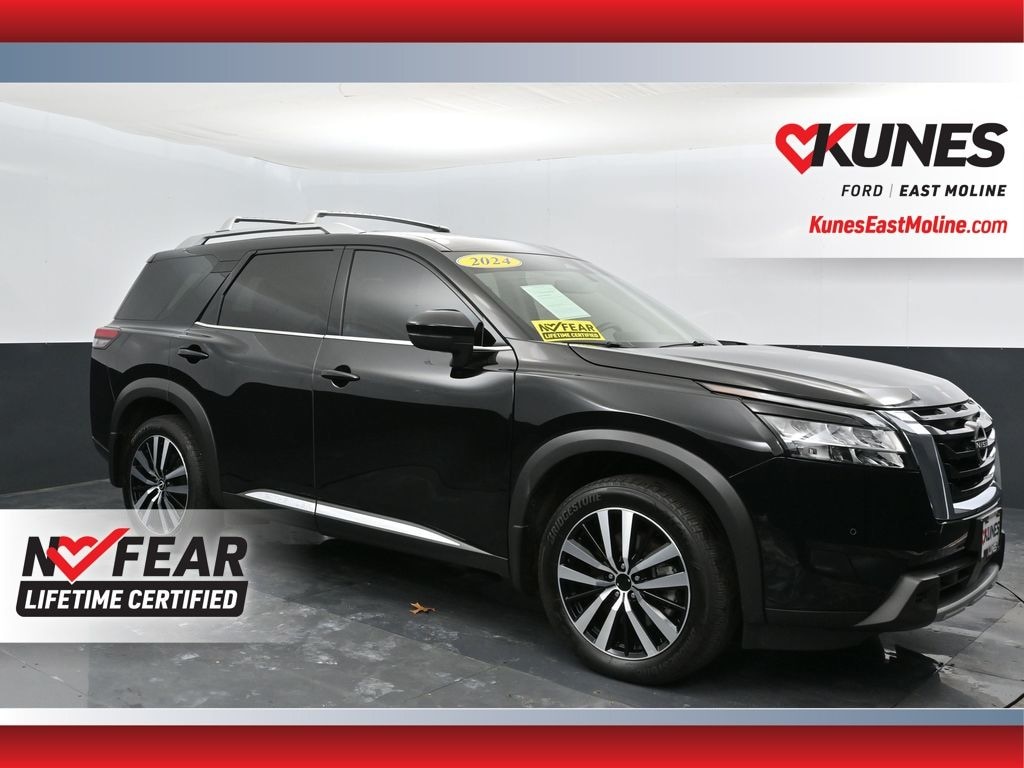 2024 Nissan Pathfinder Platinum Super Black 3.5L V6 DOHC CARFAX One-Owner. Clean CARFAX. NAVIGATION, HEATED/COOLED SEATS, ADAPTIVE CRUISE, ADVANCED SAFETY TECH, HEATED SEATS, PANORAMIC SUNROOF, REMOTE START, BACKUP CAMERA, SIRUS/XM RADIO, REAR PARK ASSIST, BLUETOOTH, LOCAL TRADE, COMPLETE DETAIL AND INSPECTION, WELL KEPT INSIDE AND OUT, ORIGINAL FACTORY BOOKS AND MANUALS, ** APPLE CARPLAY / ANDROID AUTO, ** BACK UP CAMERA, ** BLUETOOTH, 4WD, 4-Wheel Disc Brakes, ABS brakes, Auto High-beam Headlights, Auto tilt-away steering wheel, Auto-dimming Rear-View mirror, Axle Ratio: 4.334, Bodyside moldings, Bose Premium Audio System, Brake assist, Cross Bars, Delay-off headlights, Driver door bin, Driver vanity mirror, Dual front impact airbags, Dual front side impact airbags, Electronic Stability Control, Emergency communication system, Exterior Parking Camera Rear, Four wheel independent suspension, Front Center Armrest, Front reading lights, Fully automatic headlights, Garage door transmitter: HomeLink, Heads-Up Display, Heated door mirrors, Illuminated entry, Knee airbag, Leather steering wheel, Low tire pressure warning, NissanConnect w/Navigation & Services, Occupant sensing airbag, Outside temperature display, Overhead airbag, Overhead console, Panic alarm, Passenger door bin, Passenger vanity mirror, Power door mirrors, Power Liftgate, Power moonroof, Power passenger seat, Power steering, Power windows, Radio: AM/FM Audio System, Rain sensing wipers, Rear anti-roll bar, Rear reading lights, Rear seat center armrest, Rear side impact airbag, Rear window defroster, Rear window wiper, Reclining 3rd row seat, Security system, Speed control, Speed-sensing steering, Speed-Sensitive Wipers, Spoiler, Steering wheel memory, Steering wheel mounted audio controls, Tachometer, Telescoping steering wheel, Tilt steering wheel, Traction control, Trip computer, Turn signal indicator mirrors, Variably intermittent wipers, Ventilated front seats. Odometer is 3844 miles below market average!