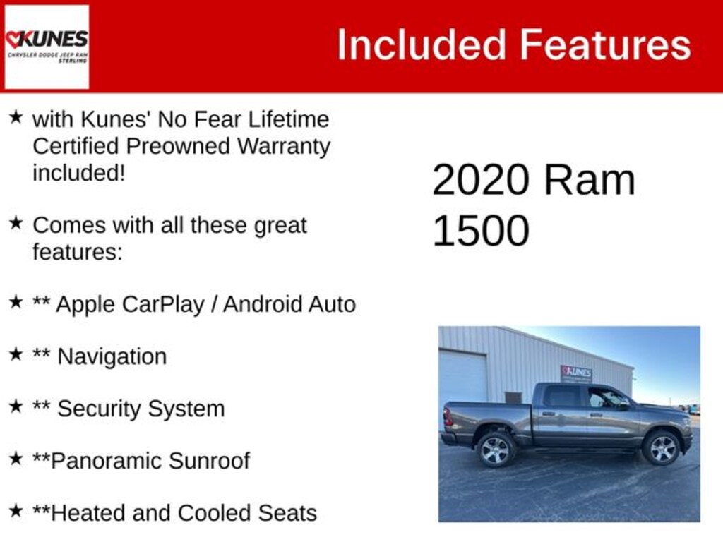 Granite Crystal Metallic Clearcoat 2020 Ram 1500 Sport Sport with Kunes' No Fear Lifetime Certified Preowned Warranty included!, Comes with all these great features:, ** Apple CarPlay / Android Auto, ** Navigation, ** Security System, **Panoramic Sunroof, **Heated and Cooled Seats, **Heated Steering wheel, ** Steering Wheel Controls, ** Keyless Entry, ** Automatic Headlights, ** Bluetooth, ** Back up Camera, **Rear Park Assist, **SIRIUS XM, Remote Start, ABS brakes, Alloy wheels, Compass, Electronic Stability Control, Heated door mirrors, Illuminated entry, Low tire pressure warning, ParkView Rear Back-Up Camera, Remote keyless entry, Traction control, Tri-Fold Tonneau Cover. Recent Arrival!
