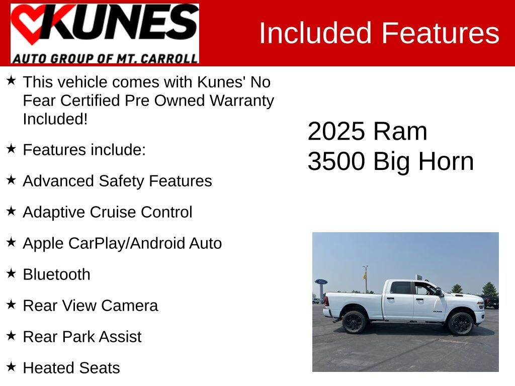 This vehicle comes with Kunes' No Fear Certified Pre Owned Warranty Included!, Features include:, Advanced Safety Features, Adaptive Cruise Control, Apple CarPlay/Android Auto, Bluetooth, Rear View Camera, Rear Park Assist, Heated Seats, Keyless Entry, Keyless Ignition, Remote Start, Navigation/GPS/NAVI, Sirius/XM, Running Boards, Bed Liner, Tow Package, Steering Wheel Controls, 3500 Big Horn, 4D Crew Cab, 6.4L V8, 4WD, Bright White Clearcoat, Black Cloth, 12" Touchscreen Display, 2 Way Rear Headrest Seat, 2nd Row In Floor Storage Bins, 4 Way Front Headrests, 40/20/40 Split Bench Seat, 4G LTE Wi-Fi Hot Spot, 9 Alpine Speakers w/Subwoofer, Air Conditioning ATC w/Dual Zone Control, Alexa Built-In, Apple CarPlay, Auto Power-Folding Mirrors, Auto-Dimming Rear-View Mirror, Big Horn Level 1 Plus Equipment Group, Black Exterior Mirrors, Black Exterior Truck Badging, Black Interior Accents, Black Wheel Center Hub, Body Color Grille Surround, Cloth 40/20/40 Premium Bench Seat, Connected Travel & Traffic Services, Connectivity - US/Canada, Dual Glove Boxes, Emergency Vehicle Alert System (EVAS), Exterior Mirrors Courtesy Lamps, Exterior Mirrors w/Heating Element, Exterior Mirrors w/Supplemental Signals, Foam Bottle Insert (Door Trim Panel), Folding Flat Load Floor Storage, Footwell Courtesy Lamp, For Details Visit DriveUconnect.com, For More Info, Call 800-643-2112, Forward & Reverse Utility Lights, Front Armrest w/Cupholders, Front Center Seat Cushion Storage, Front Seat Back Map Pockets, Global Telematics Box Module (TBM), Gloss Black Nostrils/Molded in Color Black Grille, Glove Box Lamp, Google Android Auto, GPS Antenna Input, GPS Navigation, HD Radio, Heated Front Seats, Heated Seats & Wheel Group, Heated Steering Wheel, Integrated Voice Command w/Bluetooth, LED Bed Lighting, Locking Lower Glove Box, Luxury Steering Wheel, Manual Adjust 4-Way Front Passenger Seat, Mirror Running Lights, MOPAR Deployable Bed Step, MOPAR Spray In Bedliner, Night Edition, Off-Road Information Pages, Painted Front Bumper, Painted Rear Bumper, Power 2-Way Driver Lumbar Adjust, Power Adjust 8-Way Driver Seat, Power Adjust Mirrors, Power Heated Fold Telescopic Mirrors, Power Telescoping Mirrors, Power-Adjustable Convex Aux Mirrors, Quick Order Package 2UZ Big Horn, Radio: Uconnect 5 Nav w/12.0" Display, Rear 60/40 Folding Seat, Rear Dome w/On/Off Switch Lamp, Remote Start System, Remote USB Port - Charge Only, Selectable Tire Fill Alert, SiriusXM Radio Service, SiriusXM w/360L, Steering Wheel Mounted Audio Controls, Storage Tray, Trailer Tow Pages, Wheels: 20" x 8.0" Black Painted Aluminum.